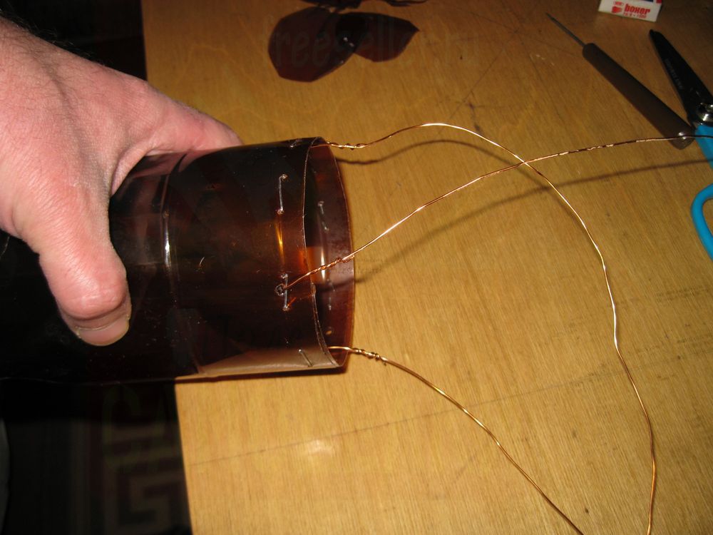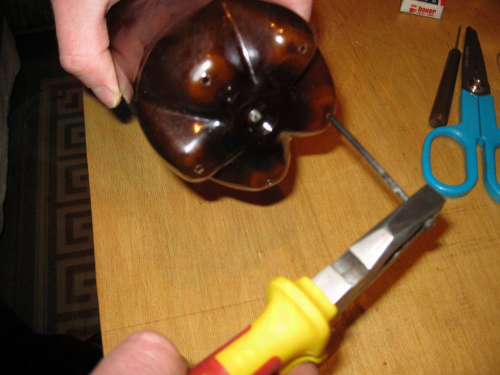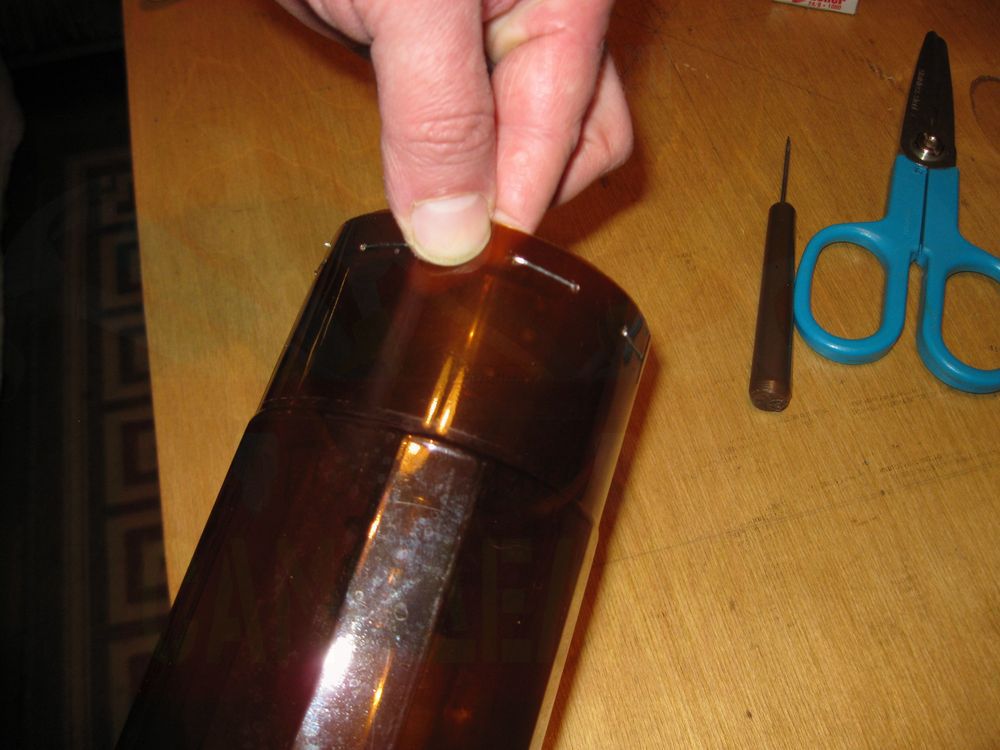 Затем скрепляем горловину с корпусом бутылки при помощи канцелярских скоб. Для этого прокалываем в верхней части корпуса шилом по два отверстия на расстоянии равном длине скобы.