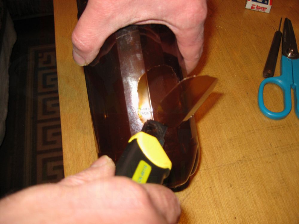 Затем отрезаем горловину бутылки, отступив примерно 3 - 4 сантиметра от плечиков.