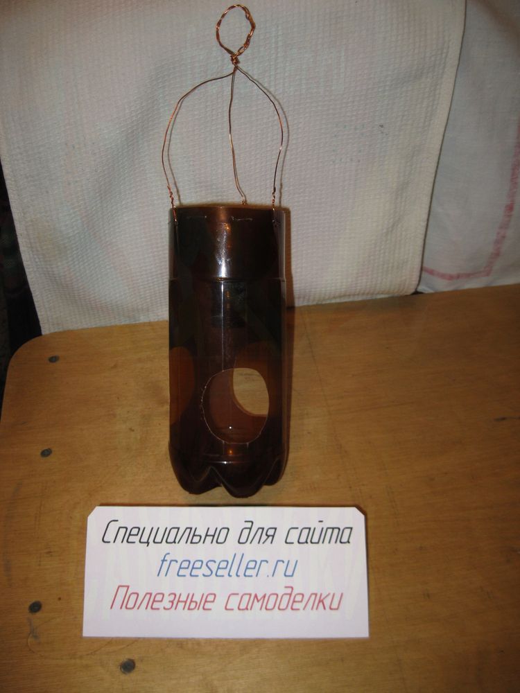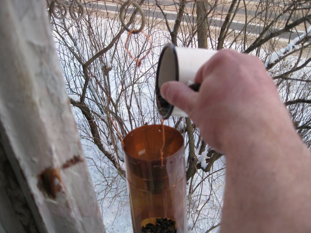 Во-вторых, не забывайте, что в такую кормушку можно насыпать только мелкий корм, поскольку крупный (например, крупные хлебные крошки), может просто застрять в узком горлышке бутылки. В качестве подходящего корма можно использовать. например, семечки подсолнечника, пшено, овсяные хлопья, мелкие орешки и т.п. Мой опыт показывает, что лучший корм для мелких птичек - это обычные семечки подсолнечника (птички их больше всего любят). Только семечки должны быть сырыми и не солеными.
