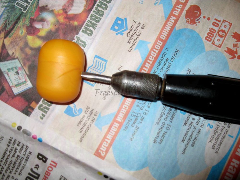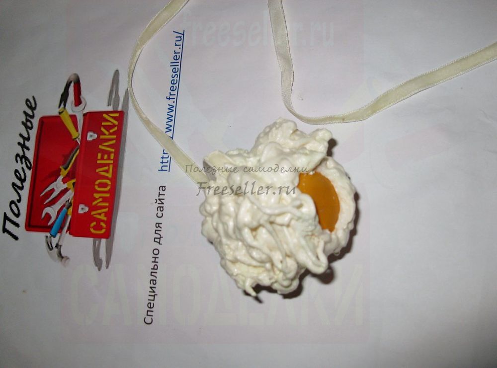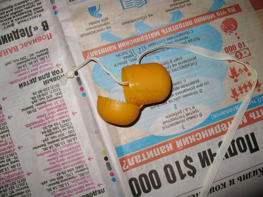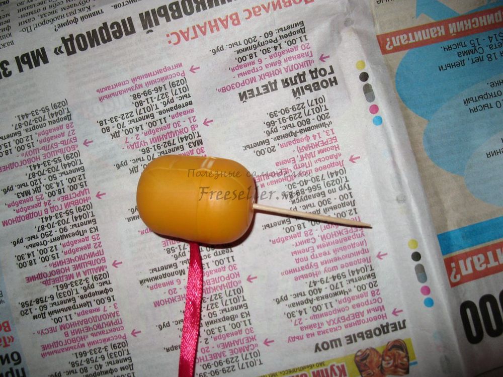 1) прокалываем шилом футляр от киндер-сюрприза посредине и с одного конца - вставляем ленточку (на ней будет висеть овечка) и зубочистку (для удобства держания заготовки при запенивании - после высыхания достать!);