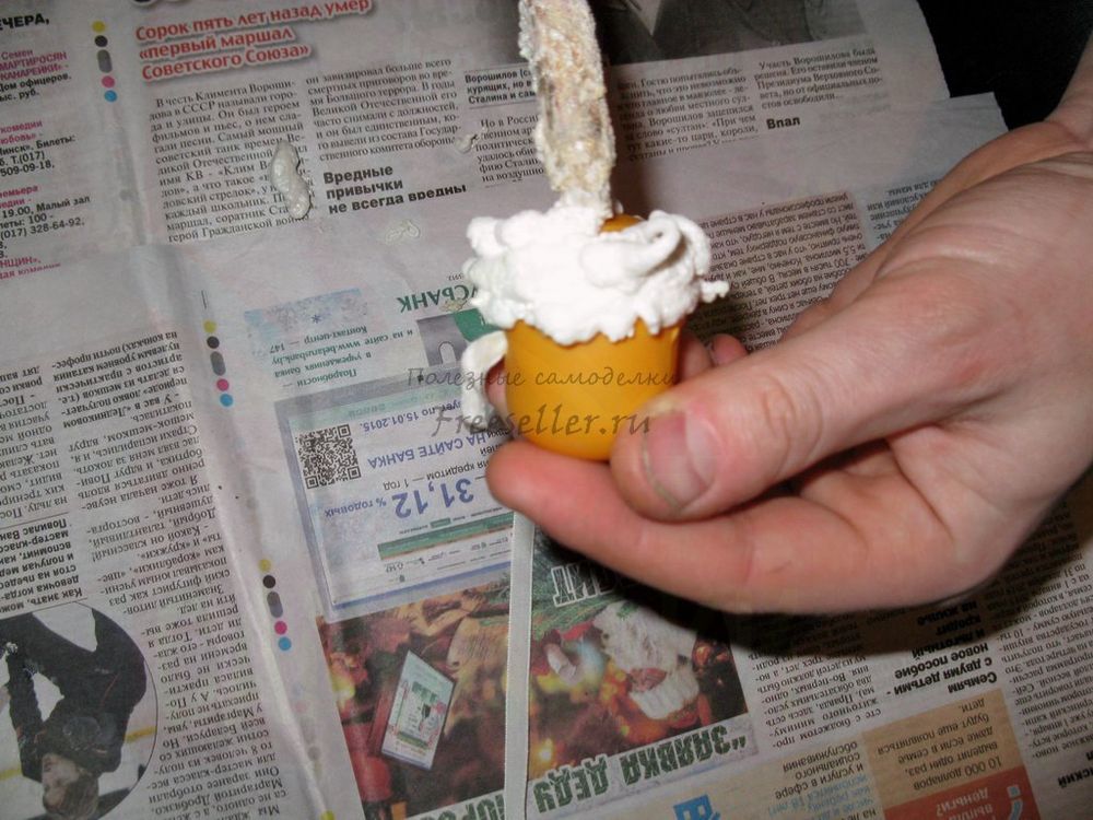 2) с помощью монтажной пены по кругу делаем имитацию шерстки овечки на заготовке, оставляя нетронутым только один конец (для мордочки);