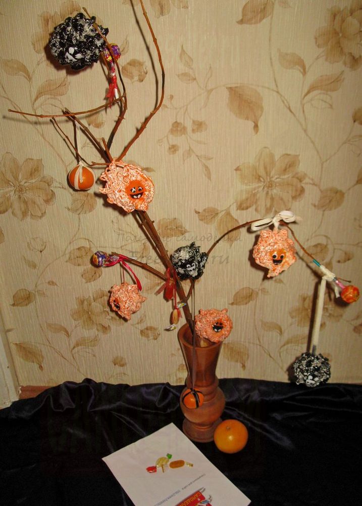 8) наряжаем елку - ставим ветку в деревянную вазочку или глиняный кувшин, привязываем к ней ленточками конфеты (не очень тяжелые для устойчивости конструкции), вешаем мандарины (или грецкие орехи) и игрушки-овечки.