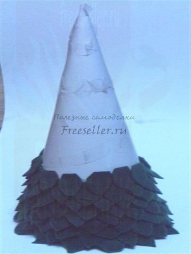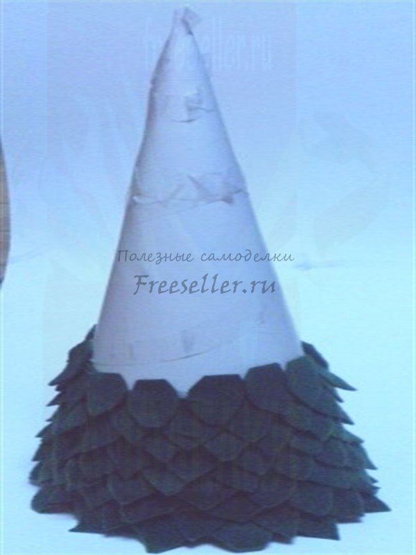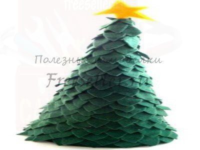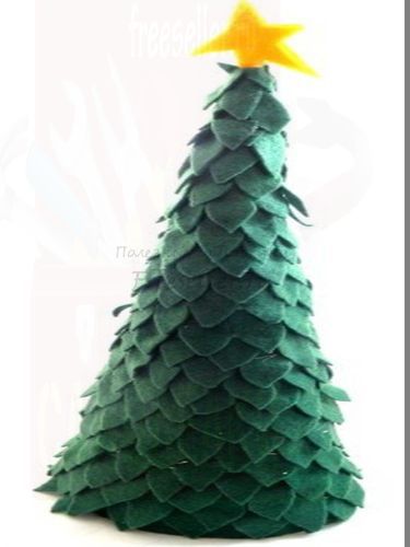 Сделайте из бумаги или картона конус. Вырежьте из войлока кусочки в форме листьев. Начните приклеивать "листья", начиная с основания конуса. Продолжайте приклеивать листья до самого верха конуса. Приклейте жёлтую звёздочку из войлока или картона. Готово!