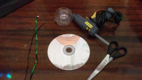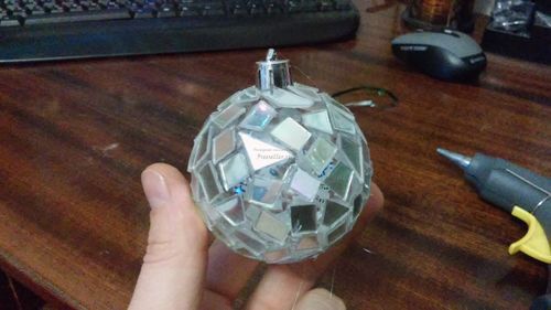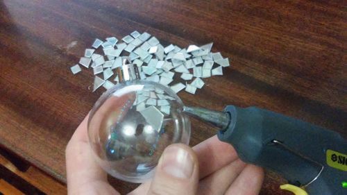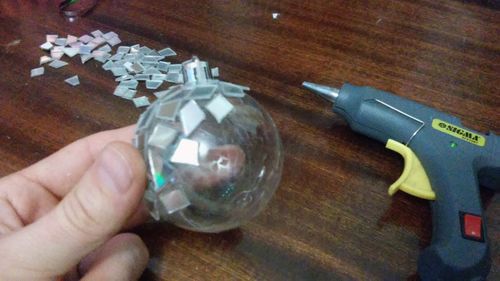 Далее берем игрушку и при помощи термопистолета обклеиваем её нарезанными кусочками диска.