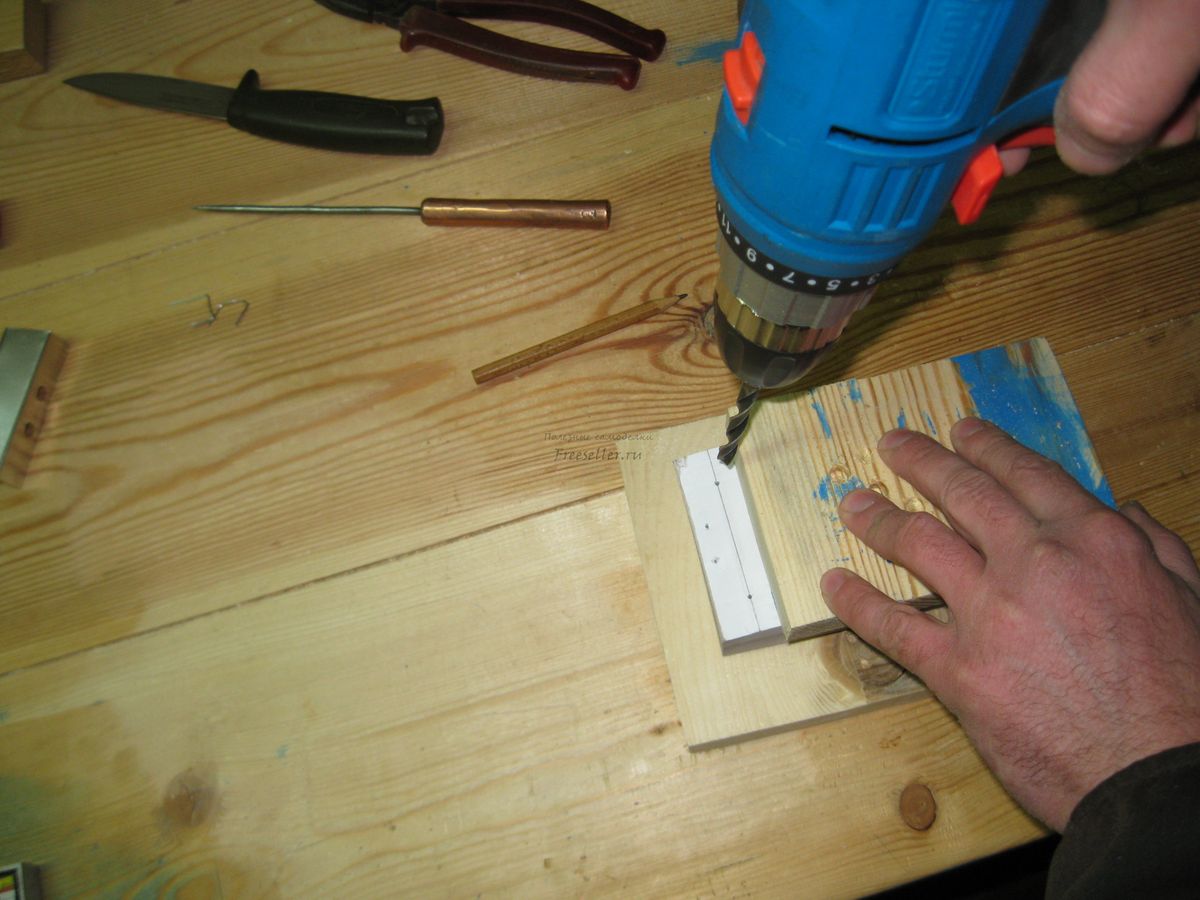 Накалываем метки отверстий шилом для более точной установки сверла и сверлим в календаре отверстия. При этом желательно во время сверления положить сверху на календарь толстую дощечку и прижать ее посильнее. Это необходимо для того, чтобы страницы календаря были плотно сжаты и лучше и чище сверлились.