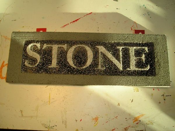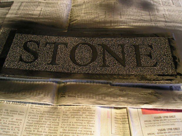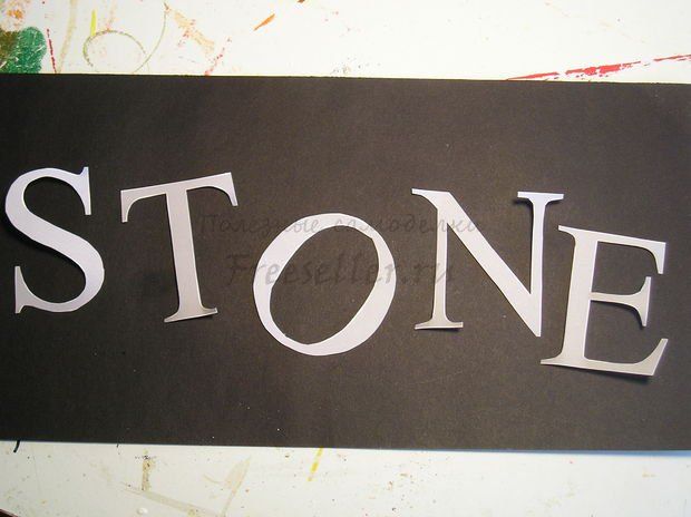 Даем высохнуть краске. Можно дополнительно нанести краску на отдельные места, усилив эффект структуры желаемой поверхности. Удаляем буквы с остатками клея.