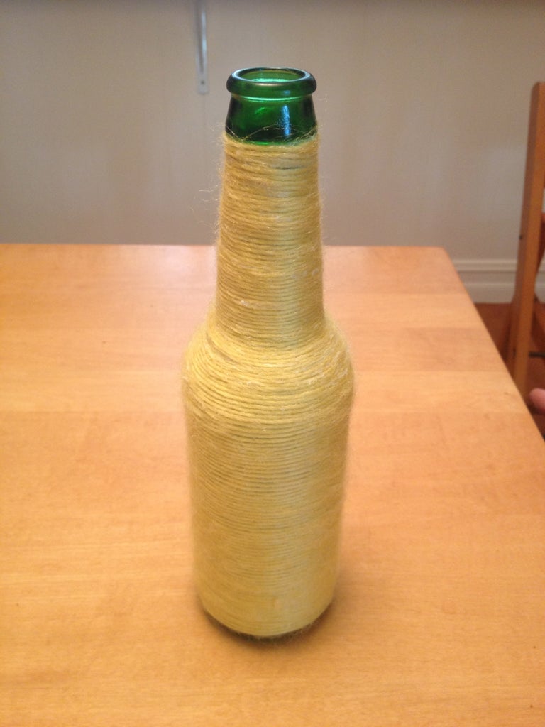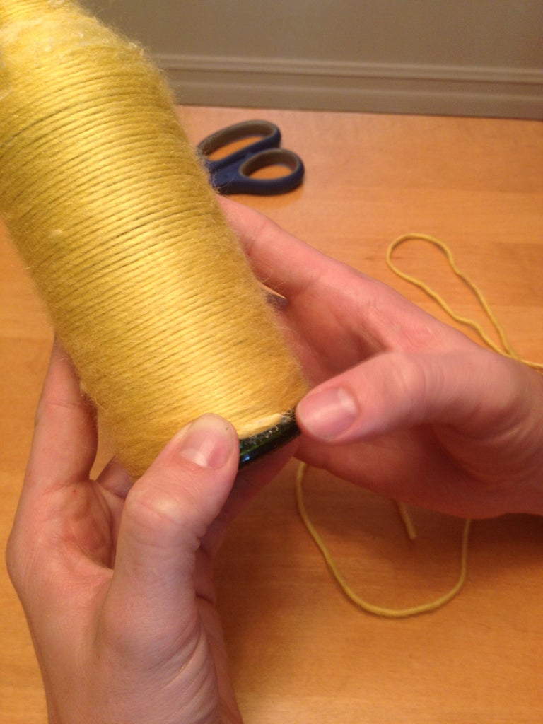 2) Обматываем бутылку, укладывая каждый виток нити как можно плотнее к предыдущему, где нужно, подклеиваем клеем.