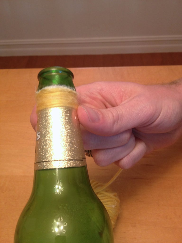 1) Фиксируем клеем край нити у горлышка бутылки.