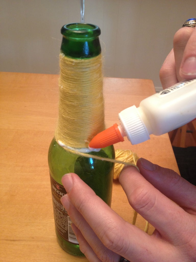 3) Фиксируем нить клеем внизу бутылки, отрезаем нить.