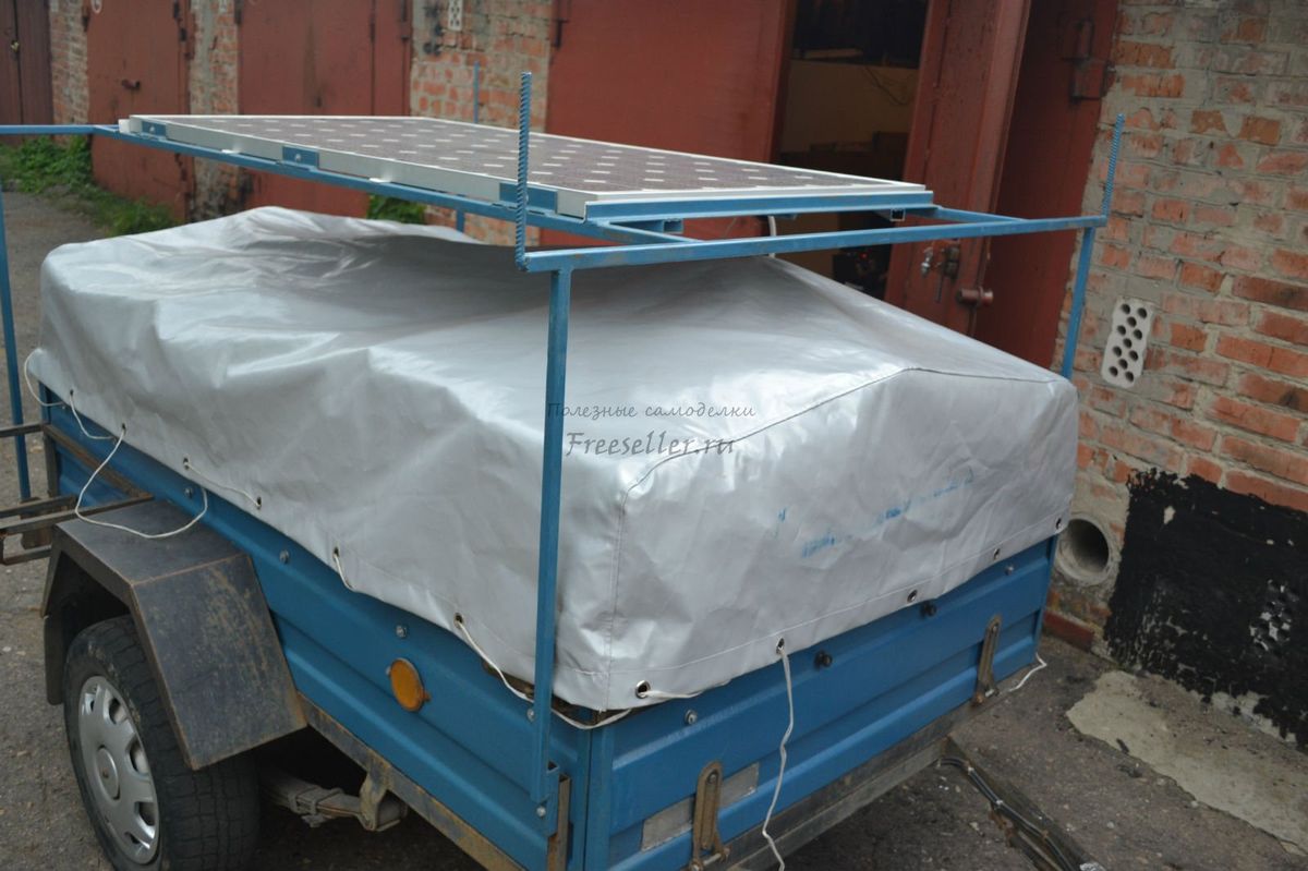 Багажник для грузового прицепа с солнечной панелью и возможностью перевозки разного габаритного туристического снаряжения.