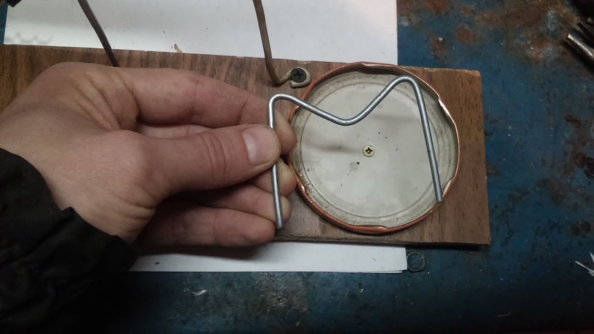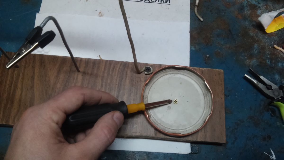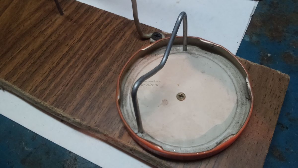 Далее в лупе так же просверливаем отверстие и насаживаем на проволоку, которую привинчиваем при помощи самореза к основанию, а так же привинчиваем крышку.