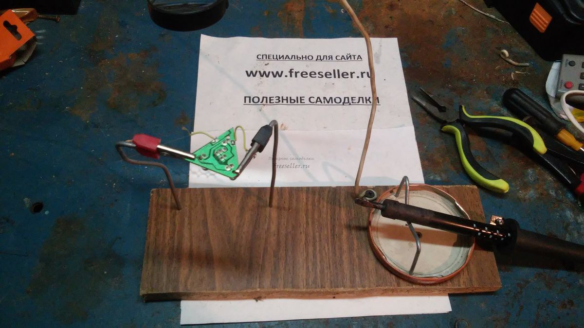 Затем изготавливаем, так же из кусочка проволоки, держатель-подставку для паяльника как показано на фото.
