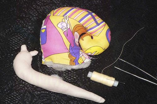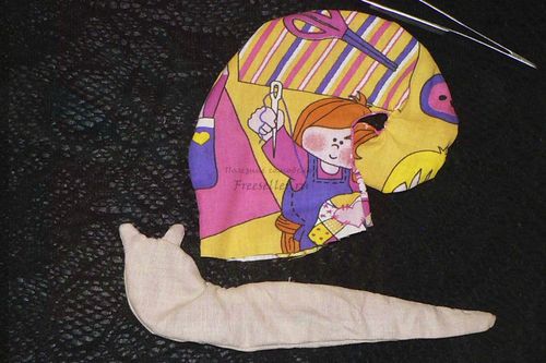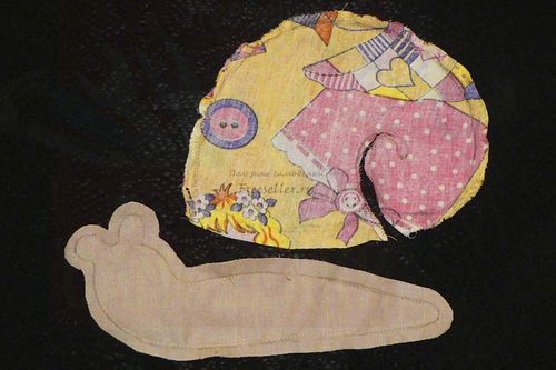 Прошиваем так как есть, небольшой участок оставляем не прошитым ( тельце там, где спинка, куда будем пришивать домик, а ракушку - в самом широком месте), чтобы сквозь это отверстие набить деталь синтепоном.