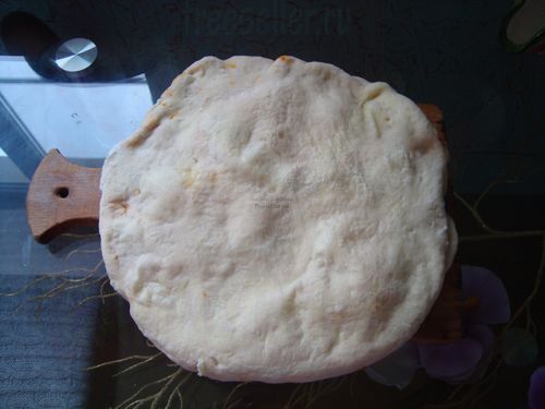 Полученного объема теста хватает примерно на 4 средних пиццы. Раскатайте один блин толщиной в 0,5-0,7 см и разложите его на тарелку.