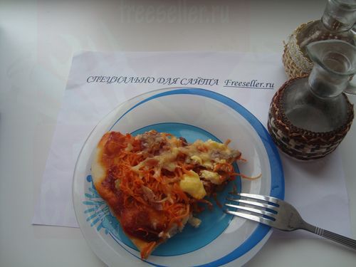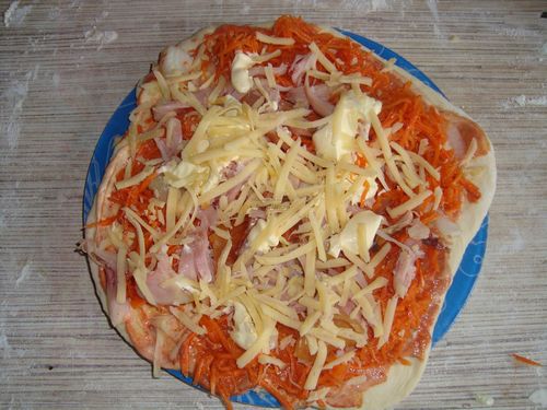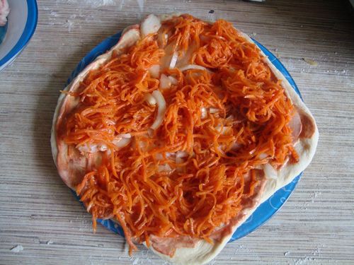 Далее, смажьте основу томатной пастой, майонезом, разложите морковку и лук.