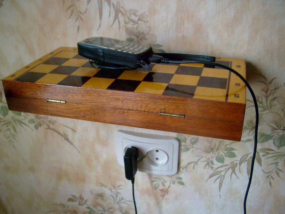 Старую шахматную доску можно легко и быстро превратить в удобную полочку для зарядных устройств.