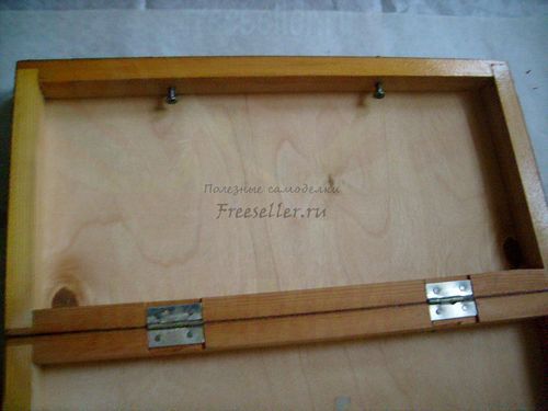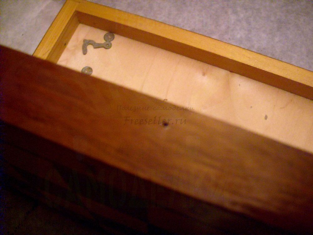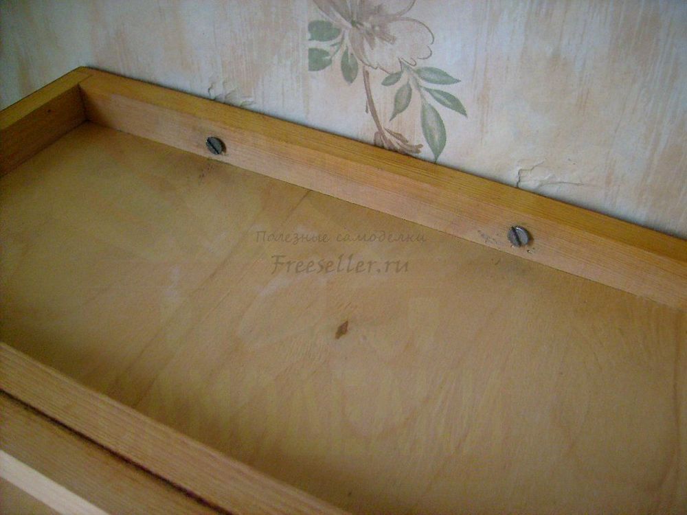 2. По разметке ввинчиваем спереди в боковину нижней части доски два шурупа. Изнутри наружу насквозь.