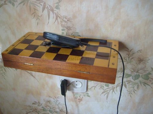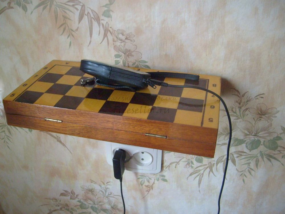 Шахматная доска много лет лежала у нас без дела - фигуры по величине намного больше клеток, и играть на ней в шахматы нельзя. Мы решили смастерить из неё функциональную складную полочку, разместив её над розеткой для удобства зарядки телефонов и прочих устройств.