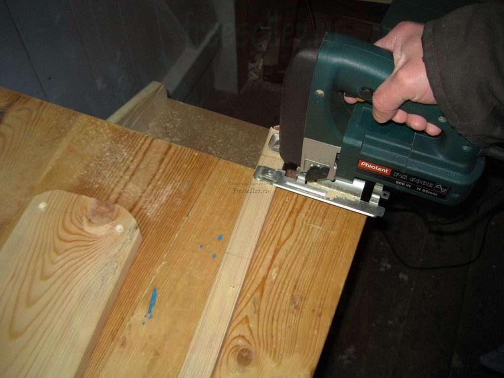 Тем не менее, если вы захотите сделать такую же подставку и у вас будут в наличии шурупы необходимой длины, то можно обойтись только шурупами и вообще не делать две эти планки-основания ножек. Только при этом обязательно выбирайте длину шурупов для ножек и соответственно высоту всей подставки в зависимости от максимального вылета пильного диска вашей электропилы вместе с кожухом.