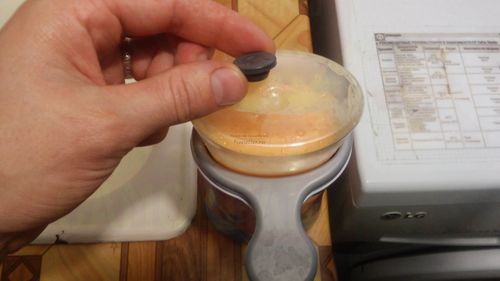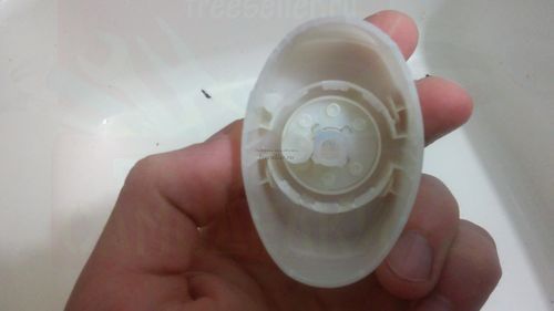 Флакон с жидким мылом не очень большого объема, поэтому оно быстро заканчивалось. Покупать новые на замену выходит дороговато, да и видов их у нас в магазине очень мало. Сначала я попытался снимать флакон, отсоединять крышку и наливать обычного жидкого мыла, но сам флакон устроен таким образом, что уже после третьего снимания зубцы на крышке отломились и она больше не держалась на флаконе, пропуская мыло (на фото ниже видно какие зубцы обламывались)