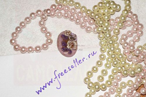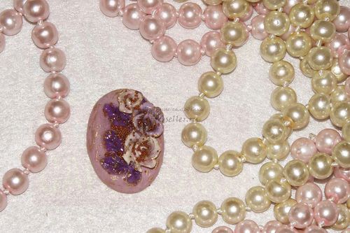 У нас вместо лака был гель, полимеризующийся под УФ-лампой, для красоты мы также добавили к розочкам и листикам немного «бульона» - декоративных бронзовых микро-шариков. Кабошон выглядит так, как будто создан из фарфора.