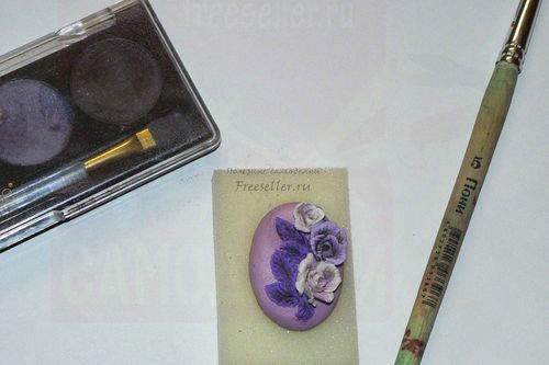 Берем тени для век фиолетовой палитры и кисточкой оттеняем рисунок лепестков и листиков, это, как и позолота, поможет создать эффект старения.