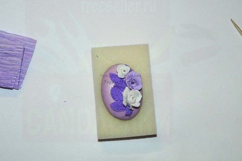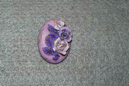 Теперь из темно-фиолетовой полимерной глины делаем несколько лепестков, придав кусочкам пластики удлиненную каплеобразную форму. При помощи пушера наносим рисунок прожилок и делаем надрезы по краям. Крепим листики к кабошону.