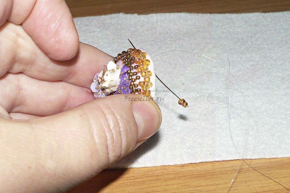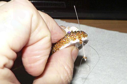 Выводим иглу с нитью с изнанки на лицо между крайним и вторым рядом бисера.