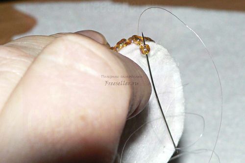 Нанизываем две оранжевых бисерины, втыкаем иглу с лицевой на изнанку так, чтобы вместились две набранных бисерины.