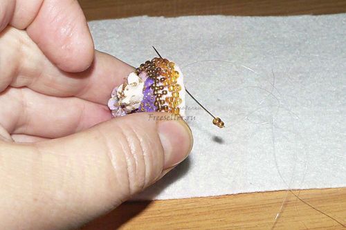 С третьего ряда переходим с обычного бисера на микробисер, шьем также в шахматном порядке, стягиваем нить сильнее, так как микробисер гораздо мельче обычного.
