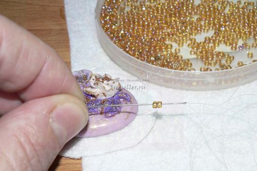 Продолжаем шить таким образом по одной бисерине вокруг кабошона. Это будет первый ряд. Следите, чтобы бисерин было четное количество.