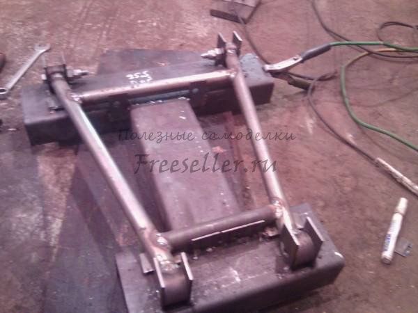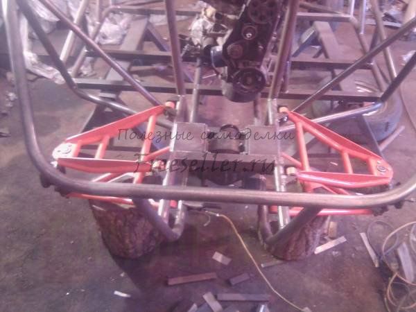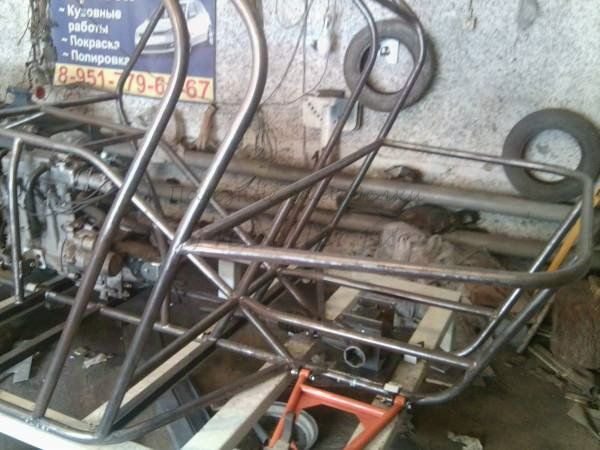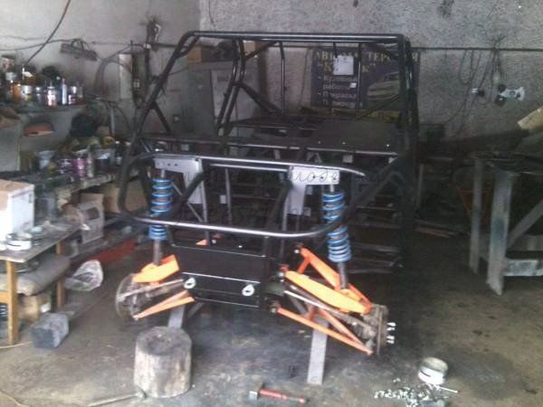 Рама выполнена из бесшовной холоднокатаной трубы 38мм, стенка 2мм сталь20, обшивка алюминий. Мотор сейчас от ваз 2110 инжектор, 4вд, межосевая блокировка, вес 820кг, колеса "ГОРИЛЛА"30 дюймов, аморты - задние 2109, пружины - задние нива и 2110, независимая подвеска и дисковые тормоза в круг, колея 1600, ширина 1700, база 2080мм, длина 3400мм, среднемоторная компоновка развесовка примерно 50 на 50. Максимальная скорость на 5-ой передаче 70км/ч, кулиса кпп от старого фольцвагена пассат. Чертежей нет все строилось по месту. Почти все запчасти брались на металлоприемке, и б.у в автосервисах, и со старых доноров. Бюджет на вездеход 80 тысяч рублей!
