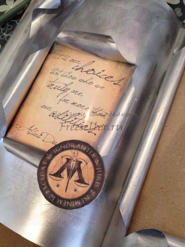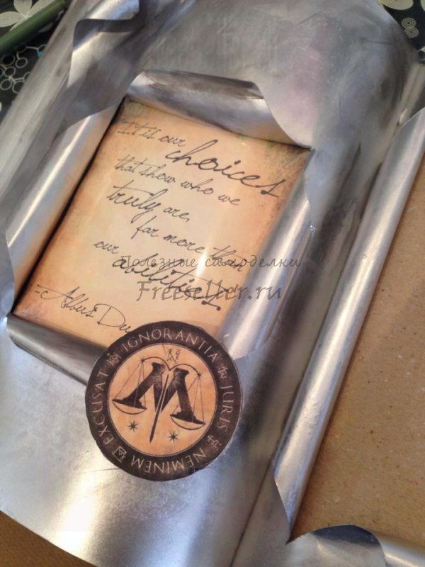 6. Вложите лист с цитатой из Гарри Поттера в окошко, прикрепите эмблему министерства магии. Для эффекта ламинирования, используйте пластик из-под коробки, например.