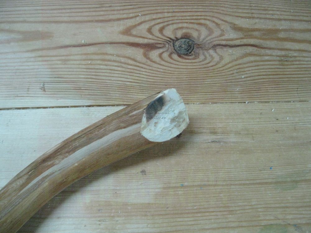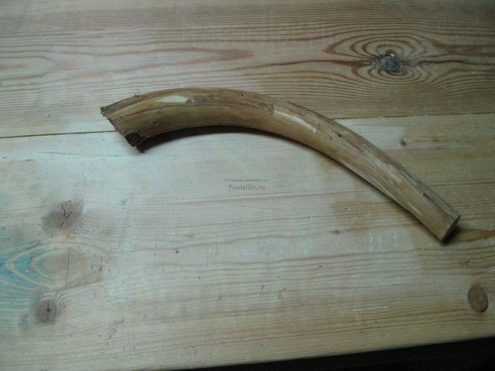 Дело в том, что ранней весной прошлого года, производя обрезку садовых деревьев, я увидел одну причудливо изогнутую ветку. Эта ветка росла в качестве поросли из пня старого вяза, который уже давно спилили. Тем не менее, в этом месте постоянно растет молодая поросль, которую периодически приходится обрезать. А поскольку древесина вяза очень твердая и прочная, то ее можно использовать для различных поделок. Именно поэтому я не стал сжигать эту ветку, а отпилил от нее наиболее изогнутый участок, снял с него кору и положил в сарай на просушку.