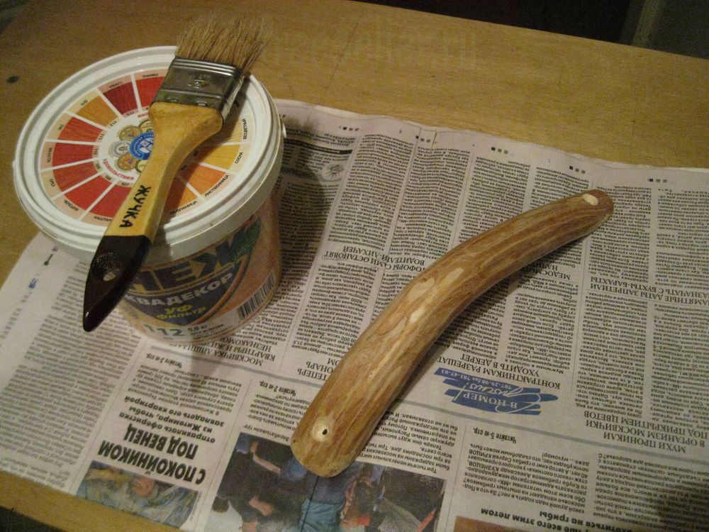Ну и поскольку наша ручка будет эксплуатироваться в уличных условиях, а также для большей гладкости, необходимо покрыть ее двумя, тремя слоями, какого-нибудь декоративного защитного антисептика.