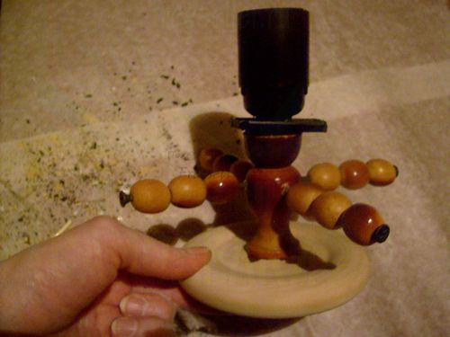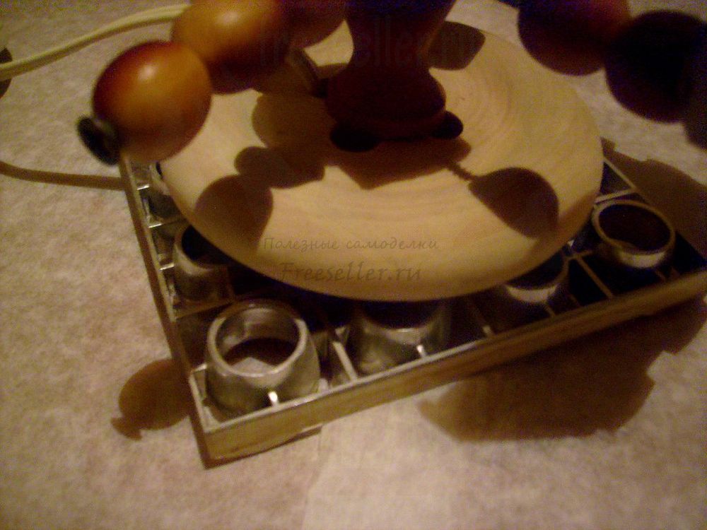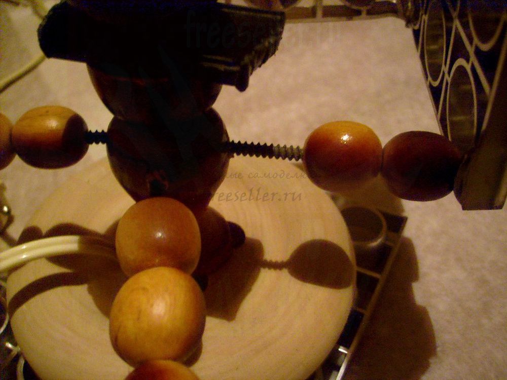 Собираем патрон. По периметру стойки ввинчиваем четыре длинных шурупа, нанизав на них деревянные бусины для красоты. Два - для крепления экрана-абажура, два - для равновесия.