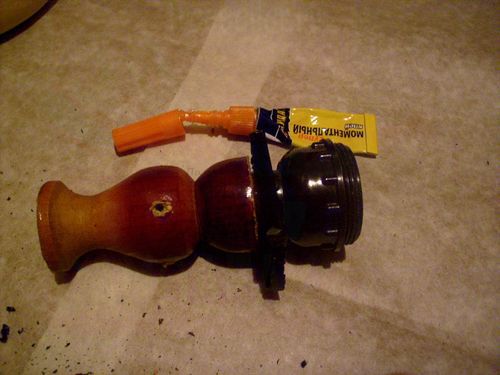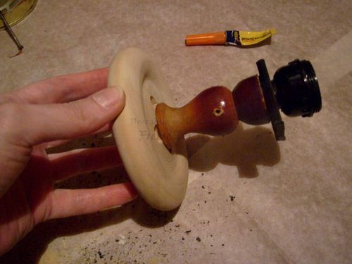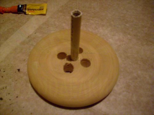 2. Суперклеем приклеиваем низ патрона к деревянной стойке, совместив отверстия.