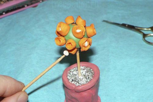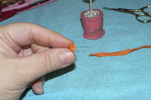 Начинаем лепить цветочки. Для этого раскатываем оранжевую пластику в колбаску, расплющиваем ее и, отрывая понемногу, скатываем оторванный кусочек спиралькой-розочкой. Крепим к шару при помощи зубочистки или тонкой деревянной палочки. Делаем около 10 таких розочек и крепим их не плотно, так как у нас будут и другие элементы декора.