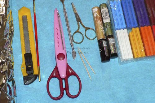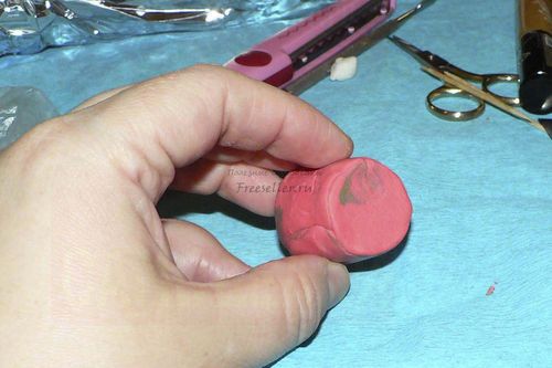 Берем голубую пластику и скатываем из нее колбаску, затем расплющиваем ровненько и текстурируем.