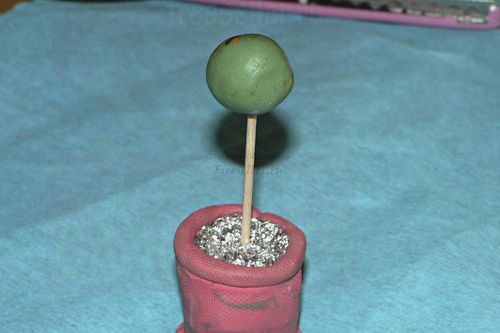 Втыкаем в центр горшочка деревянную зубочистку так, чтобы она держалась устойчиво. Насаживаем на верхний конец зубочистки небольшой шар из пластики.
