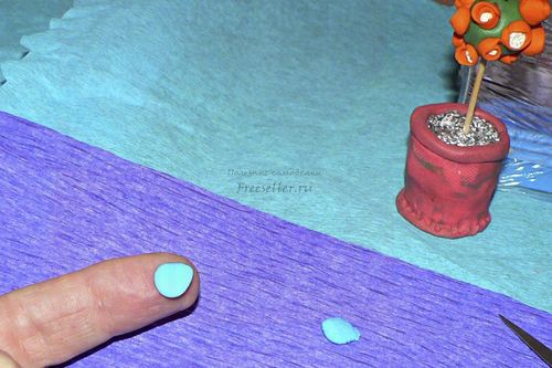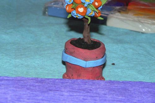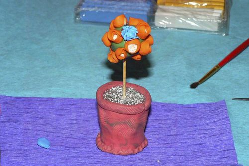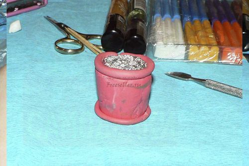 Формируем из полимерной глины донышко и прилепляем его к горшочку снизу.