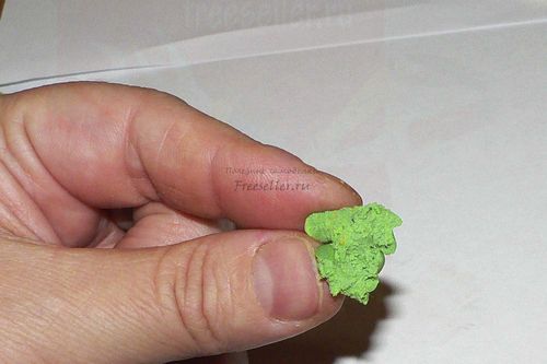 Берем зеленую пластику и смешиваем с небольшим количеством желтой, не промешивая до однородности. Разламываем вот так, чтобы глина была шероховатой.
