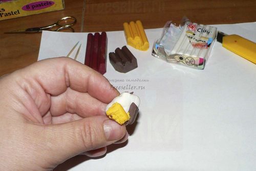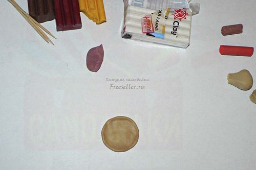 Начнем работу с приготовления «теста». Для этого смешаем белую пластику с небольшим количеством желтой и коричневой.