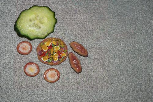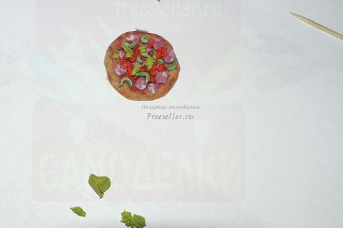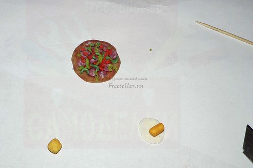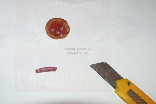 Брем остатки пластики цвета сосисок и чуть меньше белой пластики и мелко режем ножом, не смешивая до однородного цвета. Раскатываем в колбаску и нарезаем кружочками - получается вполне реалистичная салями. Укладываем колбаску на пиццу.