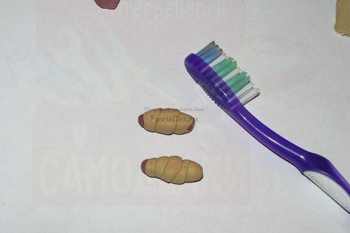Настругаем желтую и коричневую пластику, зубочисткой нанесем на сосиски текстуру и кисточкой нанесем колер, придавая сосискам в тесте из пластики натуральный вид.