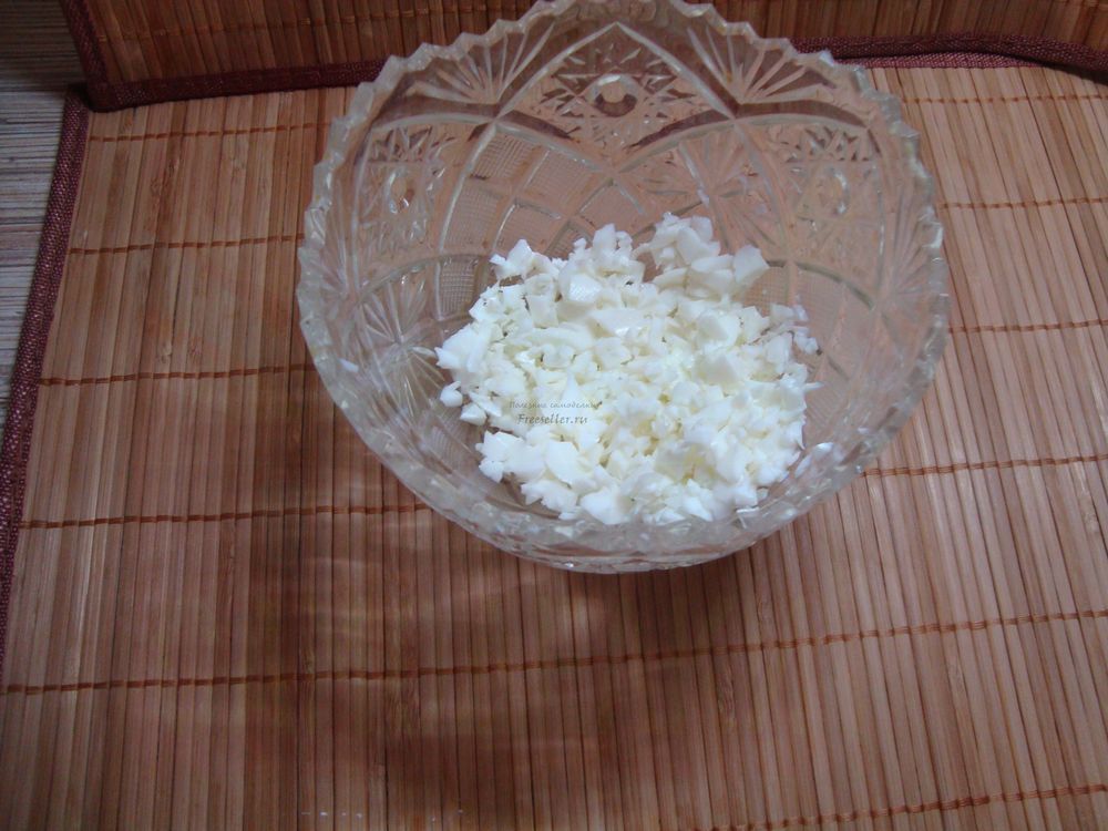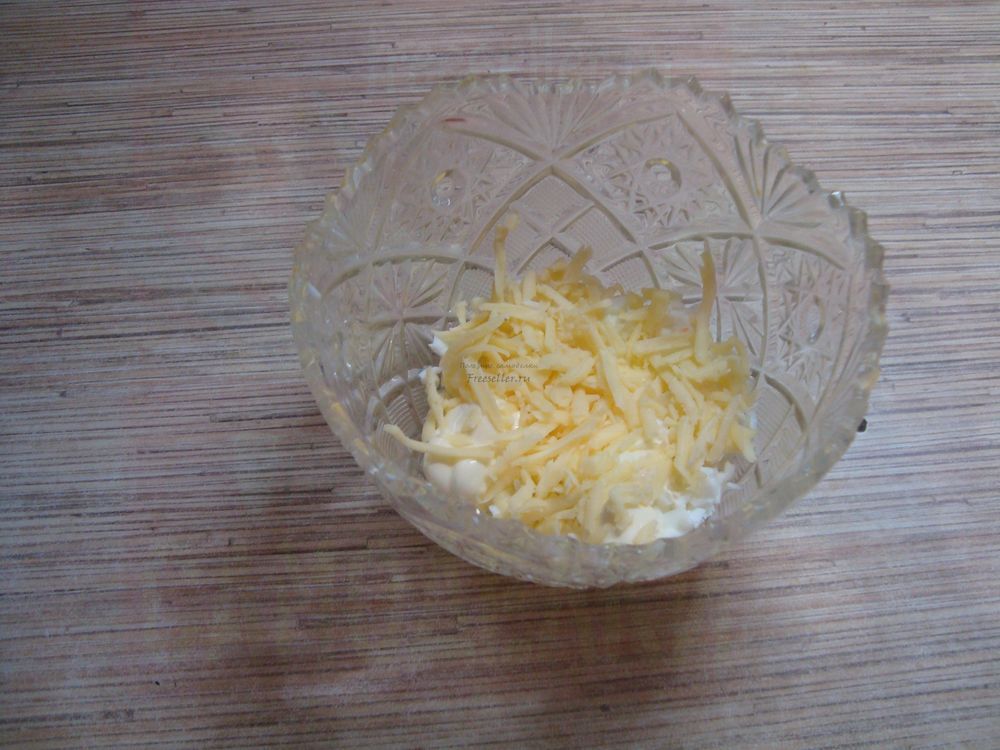 Второй слой составит твердый сыр. Его необходимо потереть на крупной терке.