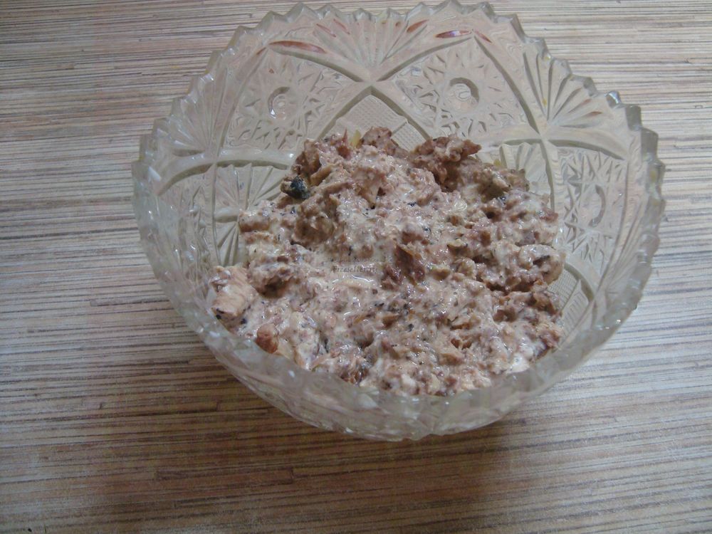 теперь необходимо открыть консервы и размять ее содержимое в тарелке с двумя каплями майонеза. Для этого действия удобнее воспользоваться вилкой.