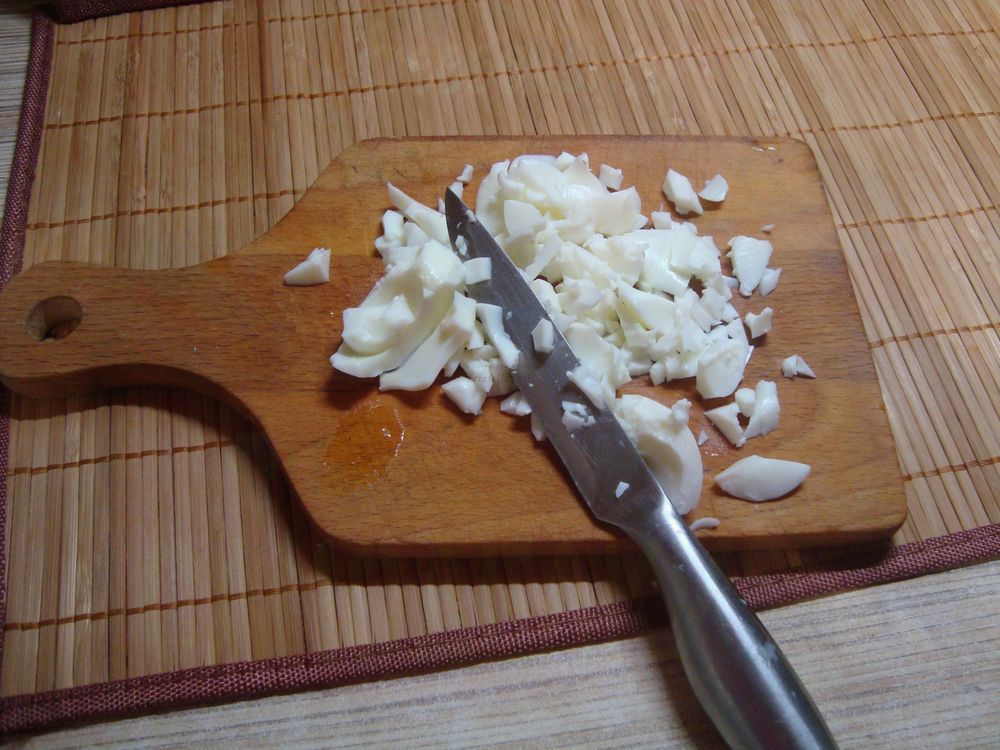 На первом этапе почистите яйца и отделите желток от белка. Далее, белок необходимо мелко порубить и выложить на дно прозрачной салатницы.