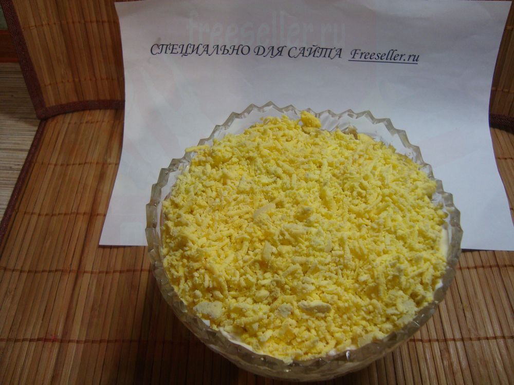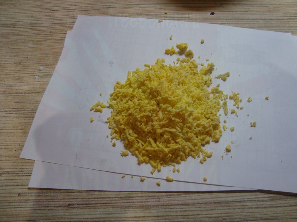 Потрите на мелкой терке желтки и украсьте ими верх салата.