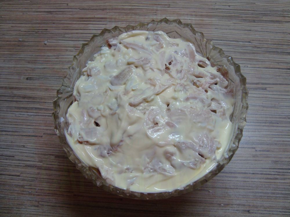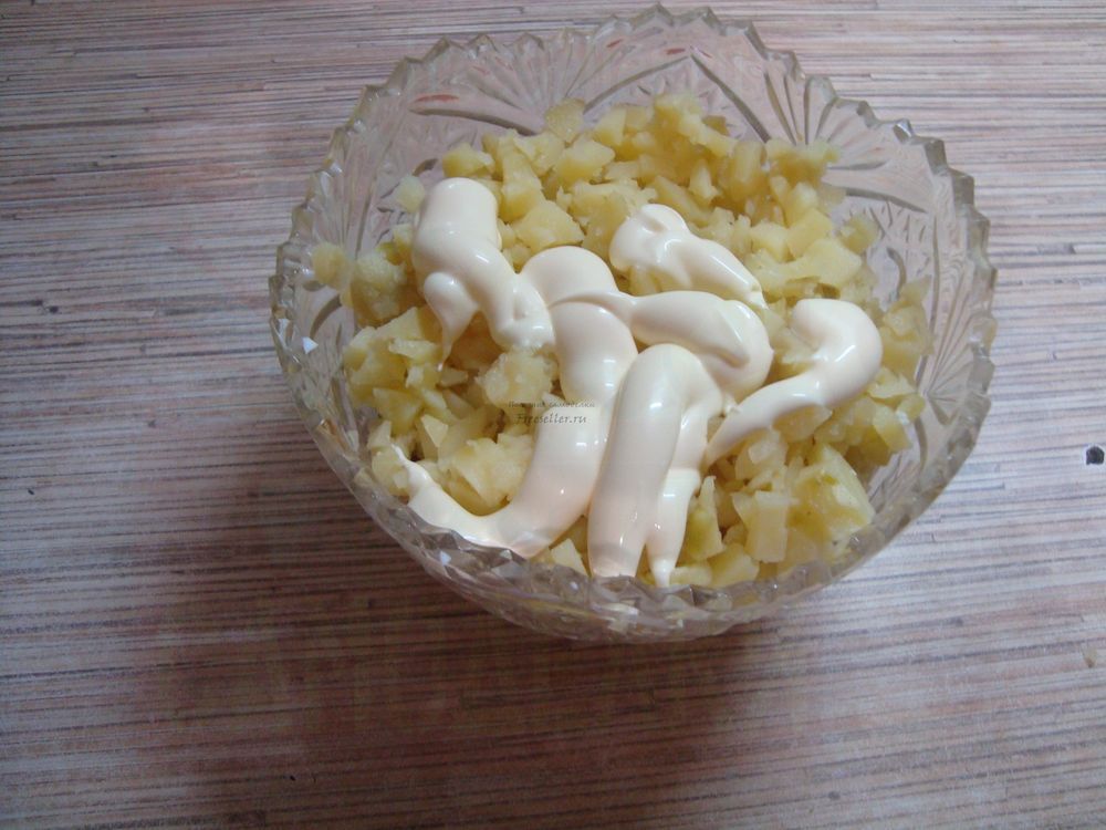 Сверху слой заливается майонезом, затем он распределяется по салату ложкой.